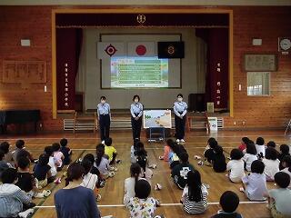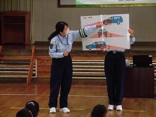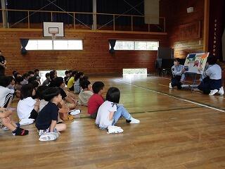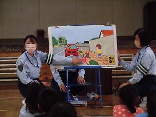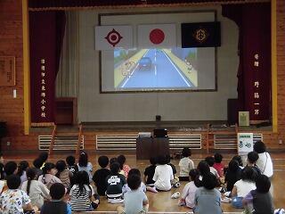昨夜の雨で運動場の状況が悪く、体育館での実施になり、安全な歩道・道路の歩き方や自転車の乗り方等について説明していただきました。そして、ビデオを視聴して交通安全について学びました。