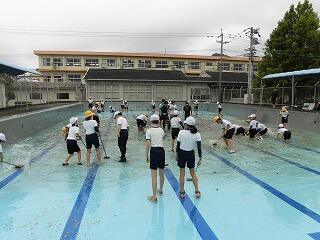 5月19日(金)に、6年生と職員で小学校のプール清掃を行いました。