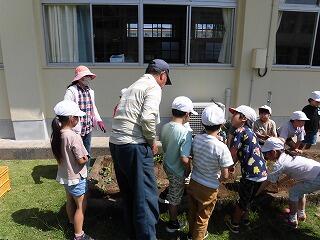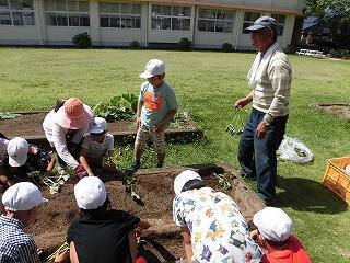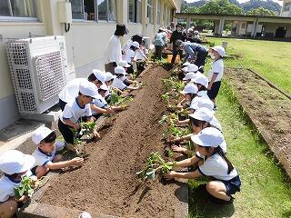 5月22日(月)に、1、2年生がさつまいもの苗を植えました。