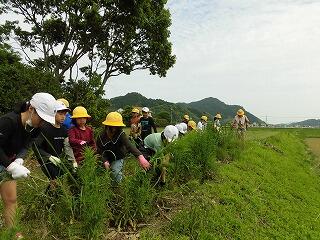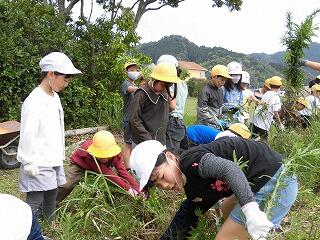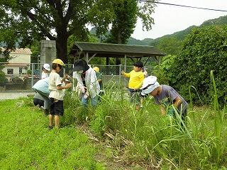「さとうきび」が大きく成長するために、畑の雑草を抜くお世話をしました。秋に行う収穫を楽しみにしている3年生です。