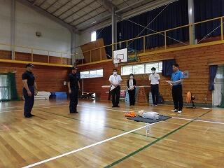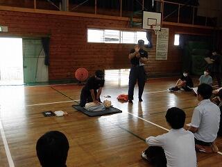 どちらも児童生徒の命を守るための大切な訓練です。「救急蘇生法講習会」では、日南市消防署救急隊の方を講師として招き、「AEDを利用した救命処置の手順」と「食物アレルギー対応(エピペンの使い方)」について教わりました。このような講習を通して、常に安全な学校づくりに努めてまいります。