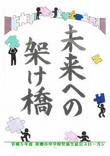 令和5年度の児童生徒会のスローガンは、「未来への架け橋」です。人と人、学校と地域,今と未来の架け橋になるような活動を児童・生徒一人一人が考え行動し、未来への架け橋となる学校へしたいと思い設定しました。また、中学生が活発な意見の交換を行う中で、小学生も中学生の意見に賛同する発言かあり、自分の意思を表現する力が身についてきている姿もみられました。