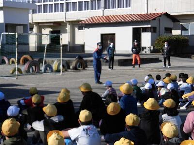 訓練に参加してくださった日南消防署の消防士の講話がありました。避難する際の3つのポイント、「邪魔な物はなかったか」「スムーズに避難することができたか」「火災で怖いのはけむりであること」について話されました。