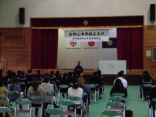 新型コロナ感染症が増加傾向にあることから、感染予防対策として、小中学校が別々に中学校の体育館で終業式を行いました。