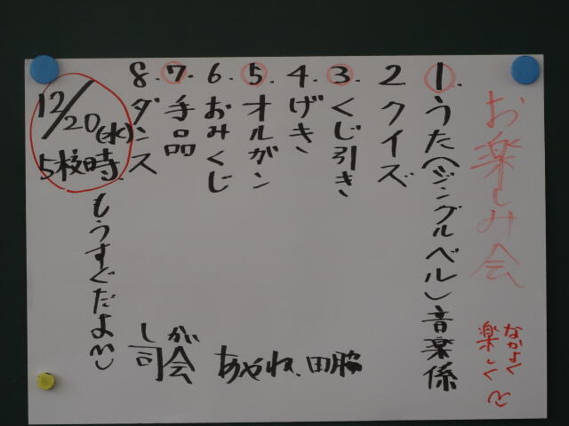 歌、手品、なぞなぞ、ダンスなど一人一人が出し物を行い、みんなで仲良く楽しみました。