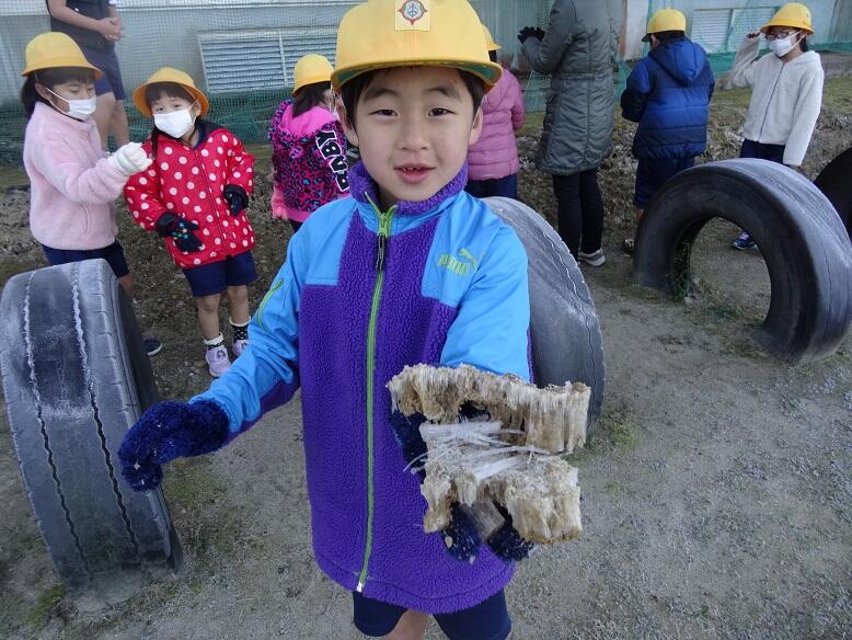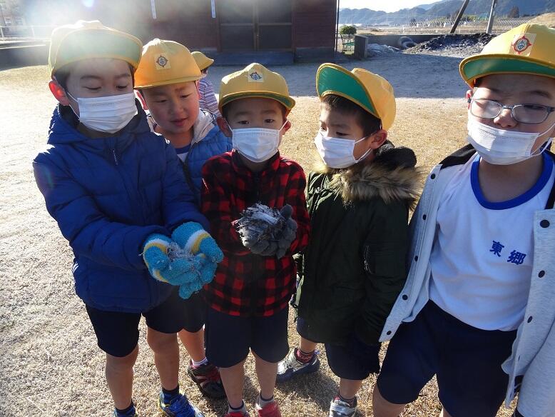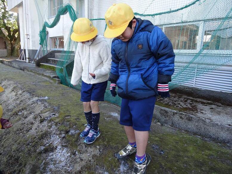 中学校運動場にできた霜柱を教材に、1年生は生活科の学習を行いました。
