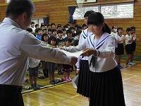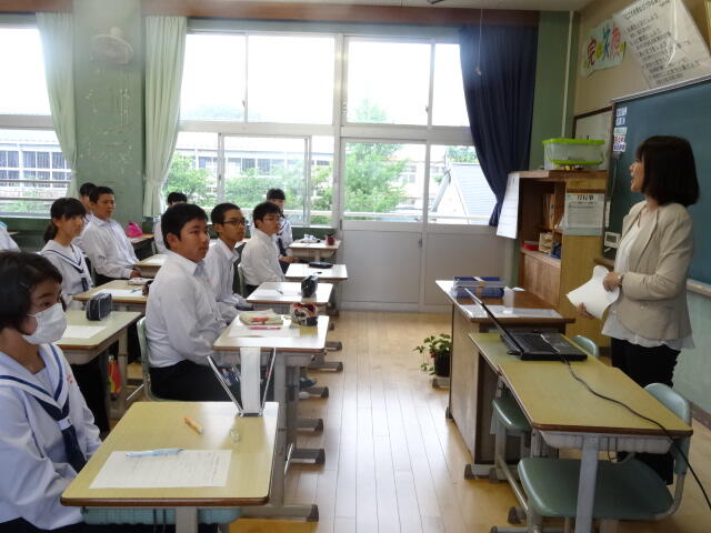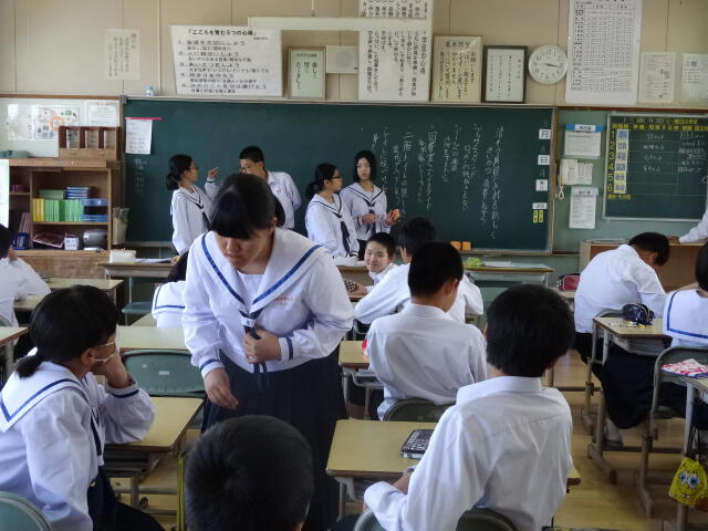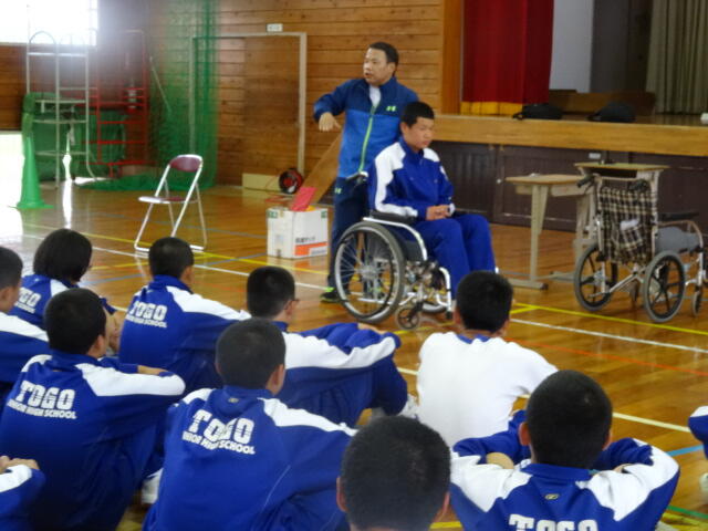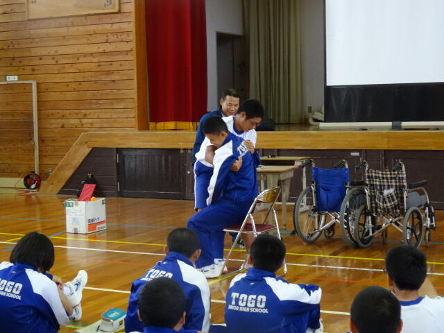 日章学園の先生を講師に迎え、9年生が福祉の学習を行いました。