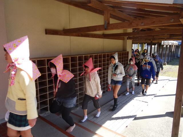 また、家庭教育学級の保護者の方が作ってくださった防災頭巾を、全ての児童生徒が使用することができました。ありがとうございます。