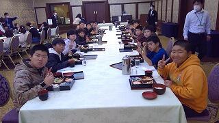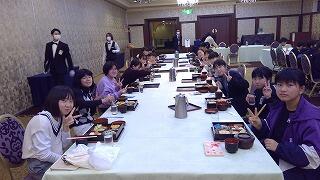 12時、修学旅行最後の食事(昼食)です。ウェルシティー宮崎で、ポークステーキをいただきました。最後とあって、よく味わって食べているようでした。給食と同じで、黙食続きでしたが、マナーを守って行儀よく食事をすることができました。