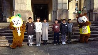本日最初の見学地、宮崎県庁につきました。県のマスコット、みやざき犬の「ひー」「むー」が、迎えてくれました。テレビ等ではよく見かけますが、直接会ったのは初めてだった児童が多く、みんな大はしゃぎでした。じゃんけん大会が盛り上がりました。
