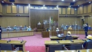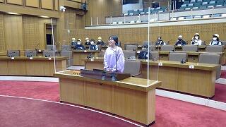 県庁では、まず県議会議場を見学しました。議長や知事、議員さんたちの座席に座り、模擬討論を行いました。様々な質問や答弁がなされました。