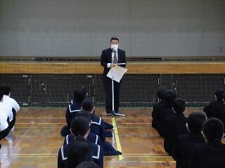 生徒指導主事の牧嵜先生は、「新型コロナウイルス感染症に対する注意」「交通・水難事故に遭わない行動」「相談窓口の紹介」「生活の心得についての確認」をしました。