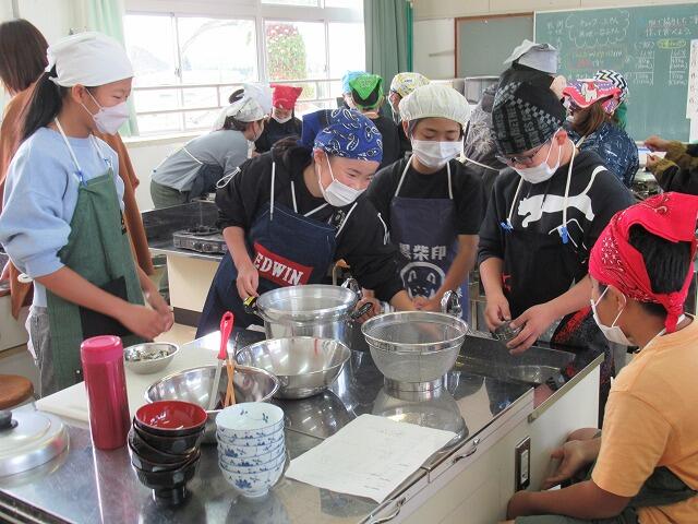11/18(火)、5年生の調理実習に、栄養教諭の先生を講師にお招きし、また、地域ボランティアの方々にもご協力いただき、ごはんとみそ汁を作りました。