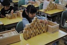 入学式でもらった飫肥杉積木日南キューブをつかった学習をしています。自分で積み上げたり、友達と協力して形を作ったりしながら、例えば遊び方のルールやきまりを学習しています。日南キューブで楽しく学習することで将来的には平面図形や立体図形につながる力を伸ばすことも目指しています。