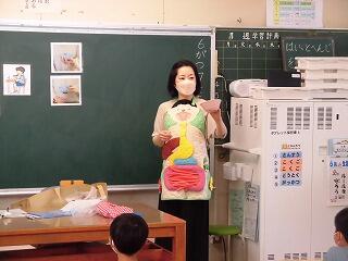 「食事のマナー」について話していただきました。「食事のマナー」は「食事のきまり」であり、そのきまりには、「行動、姿勢、食器の持ち方、箸の持ち方」の4つがあるようです。