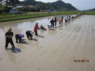 5年生が6月13日に田植えをしました。田んぼに足をいれた瞬間「うわぁー」と言う歓声を上げた子ども達でしたが、何とかもち米の苗を植え終わりました。