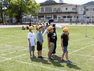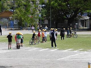 子どもたちは、運動場を使って、正しい歩行や自転車の乗り方の練習をしました。