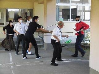 職員は、「さすまた」という防具の有効な使い方や不審者を追い込むフォーメーションの在り方について学びました。