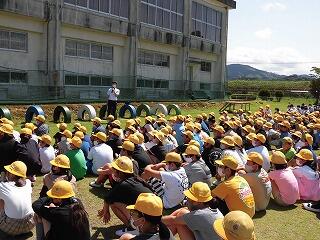 児童・生徒は放送を聞いて、中学校運動場に避難しました。