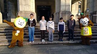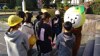 本日最初の見学地、宮崎県庁につきました。県のマスコット、みやざき犬の「ひー」「むー」が、迎えてくれました。テレビ等ではよく見かけますが、直接会ったのは初めてだった児童が多く、みんな大はしゃぎでした。じゃんけん大会が盛り上がりました。