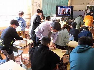 担任の先生と一緒に中学校の牧嵜先生(技術担当)が作り方を教えてくださいました。