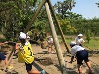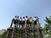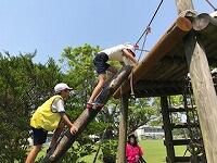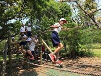 昼食は待ちに待った「フィールドアスレチック」。班のみんなと協力して様々なアスレチックに挑戦しました。