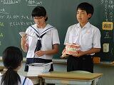 8年生の保体給食委員会の取組として、給食後の歯磨きの時間に各学級を訪れて歯磨き指導を行いました。各学年の虫歯が多い箇所の磨き方を重点的に伝えました。
