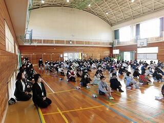 4月12日(火)の朝の時間に、それぞれの体育館で、小学校は「新入生歓迎集会」、中学校は「対面式」が行われました。