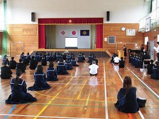 天候不良で体育館での実施になり、指導員の方に、安全な道路・歩道の歩き方や自転車の乗り方等について説明していただきました。そして、安全な自転車の乗り方のビデオを見せていただきました。
