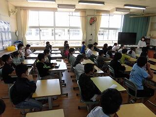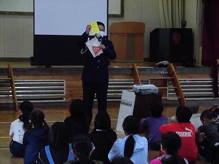 天候不良で体育館での実施になり、指導員の方に、安全な道路・歩道の歩き方や自転車の乗り方等について説明していただきました。そして、安全な自転車の乗り方のビデオを見せていただきました。