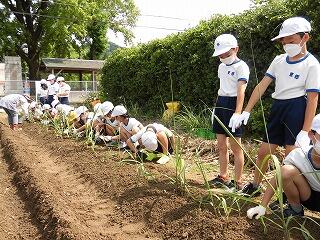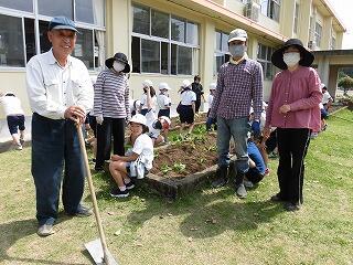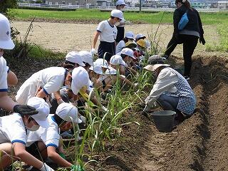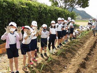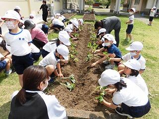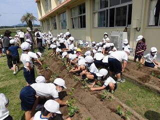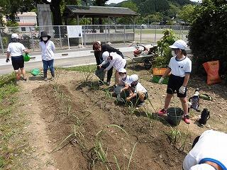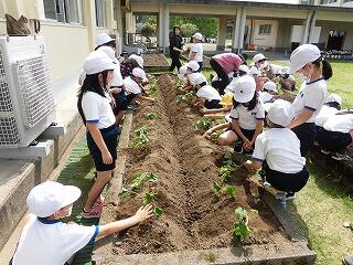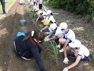 1年生には、少し難しい作業でしたが、先生や地域の方に手伝ってもらいながら植えることができました。2年生は、昨年度の経験を活かして、上手に植えることができました。