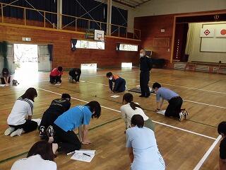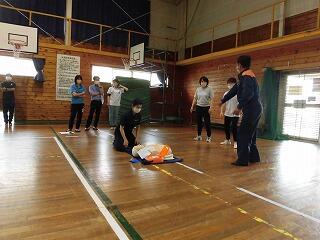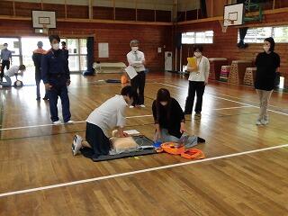 胸骨圧迫法やAEDの使い方を学んで、実際にダミー人形を使って救急処置の練習を行いました。