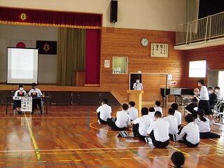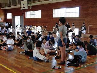 小中一貫校ならではの、6年生から9年生までが参加する「児童生徒総会」が、中学校体育館で行われました。コロナ禍の影響で、全員が集合しての開催は、3年ぶりでした。また、「しおり」のないペーパレスのタブレットを活用しての総会でした。