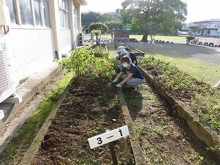 東郷小中学校は、大きな被害はなかったものの、たくさんの落葉や枝が校内に散乱していました。そこで、小学校は3~6年の児童、中学校は全学年の生徒で清掃活動に取り組みました。