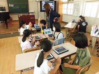 3年生の授業は、速くゴールするために、走りながら、タイミングを合わせてバトンパスをする練習が行われました。タブレットで録画し、バトンパスの様子を確かめていました。