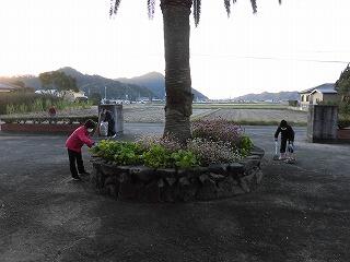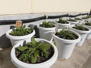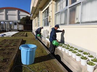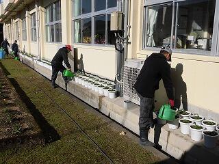 卒業式の式場を飾る鉢花の準備が始まっています。東郷小中学校の校舎の犬走に、たくさんの鉢花が並んでいます。環境整備員(東郷班)の皆さんが、一鉢一鉢、ていねいにお世話して、育ててくださっています。