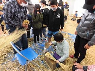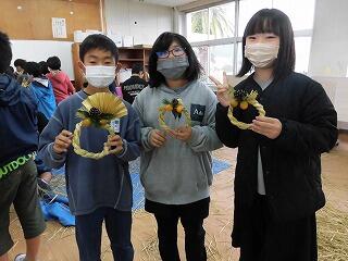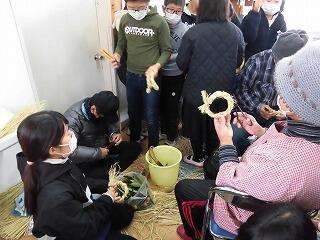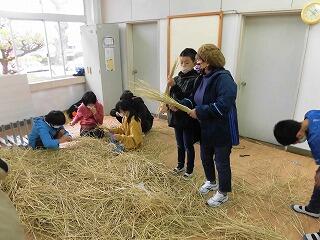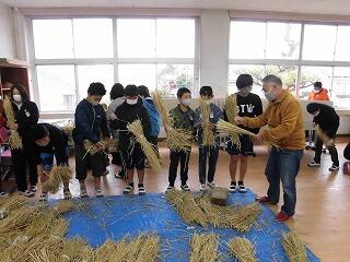 5年生が、もち米の稲刈りをした後にとっておいた「わら」を使って、「しめ飾り」を作りました。
