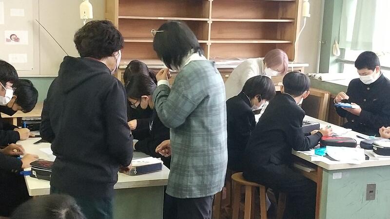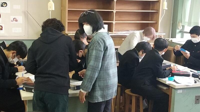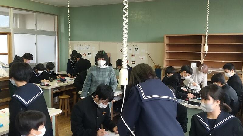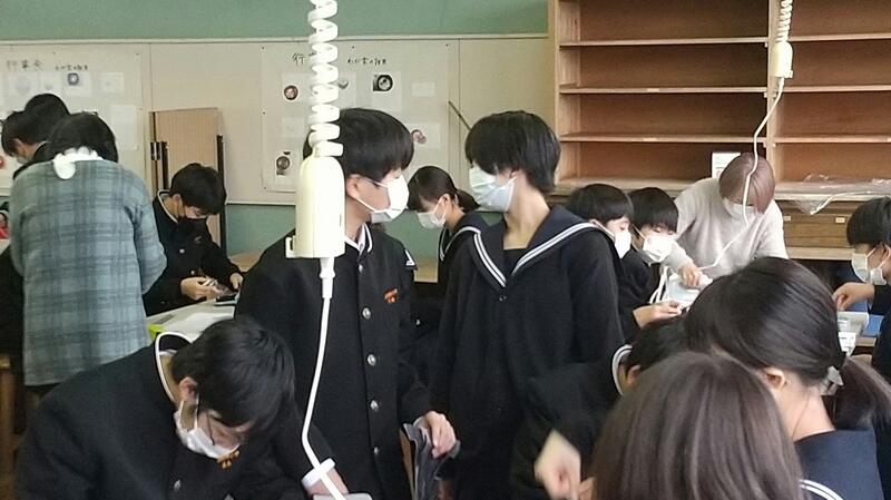 毎年、7年生が家庭科の実習でペンケース作りを行っています。アイロンを使ったり、針と糸での細かい作業で生徒たちは悪戦苦闘しています。今回も、ボランティアとして3名の方にサポーターとしてお手伝いをしていただきました。