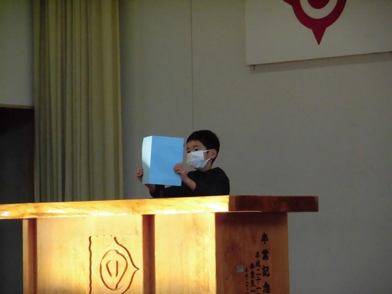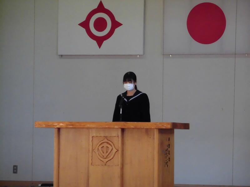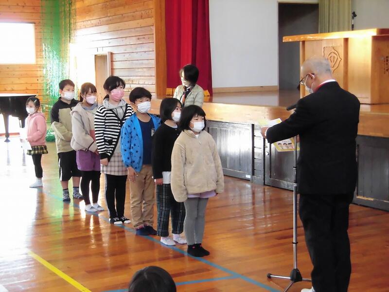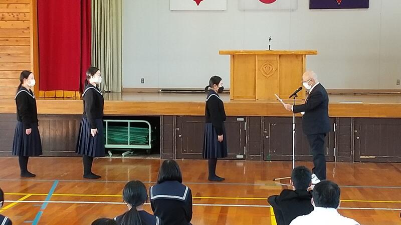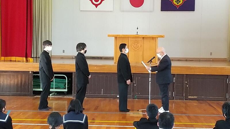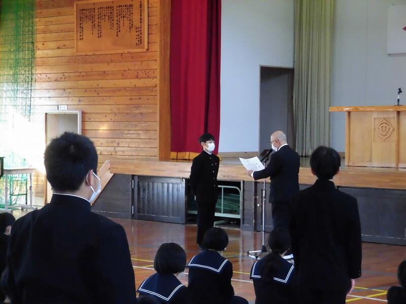 2年、9年の代表の児童・生徒が、2学期に取り組んだことや行事等でがんばったこと、3学期の目標について発表しました。表彰も行いました。