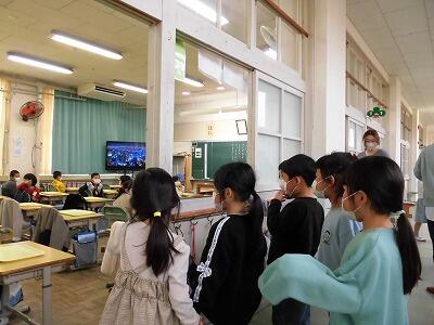 四季の森子ども園の年長児が、1年生の給食時間の様子を見学に来ました。来年度小学校に入学する年長児が、1年生の給食や小学校の施設の様子を見学して、小学校入学への期待を高めることがねらいのようです。