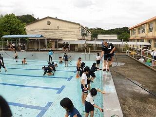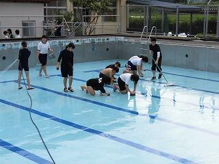 汚れの溜まった水を排水した後に、汚れているプールの底や壁を6年生がたわしでゴシゴシと磨きました。