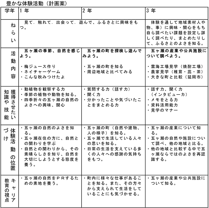 ◆五ヶ瀬を知る 五ヶ瀬の地域素材(人・物・事)を見たり・聞いたり・感じたりして、五ヶ瀬の良さを理解することであります。 ◆五ヶ瀬で学ぶ五ヶ瀬の地域教育材から学ぶことです。五ヶ瀬の自然や風土、歴史、産業などについて課題設定をし、問題解決的な学習を進めることであります。 ◆五ヶ瀬に貢献する こ五ヶ瀬町の課題解決に向けて考え、積極的に参画していこうとする態度を育成していこうとする活動であります。