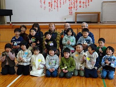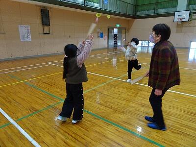 生活科「むかしのあそびをたのしもう」では、けん玉やコマ、羽子板、めんこなど、昔の遊びをみんなで楽しみました。今年は、おじいちゃん・おばあちゃんへの呼びかけを行い、5名の先生方が参加してくださいました。遊び方を教わりながら充実した活動となりました。また、手作りの竹とんぼをいただき、みんなで飛ばしました。