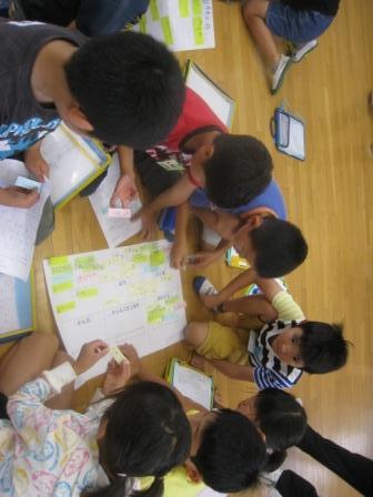 1時間目は、前時に発表し合った「学校のまわりの様子」について振り返り、それぞれの地域の共通点や相違点をはっきりさせながら、今後調べていくことを決めました。グループや全体での話合いでは、子どもたちが活発に発表し合う姿が見られました。普段、教室で学んでいる時以上に多様な意見を聞くことができたようです。