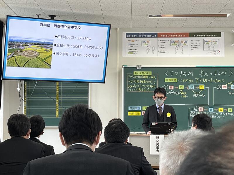 熊本県の先生方の研究授業と、九州各県の研究発表が行われ、本県を代表して、西都市立妻中学校の中武秀一郎教諭が発表を行いました。