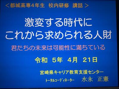 4月21日、都城高専4年生(160人)に「激変する時代にこれから求められる人財 君たちの未来は可能性に満ちている」と題して講話をしました。