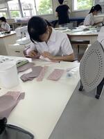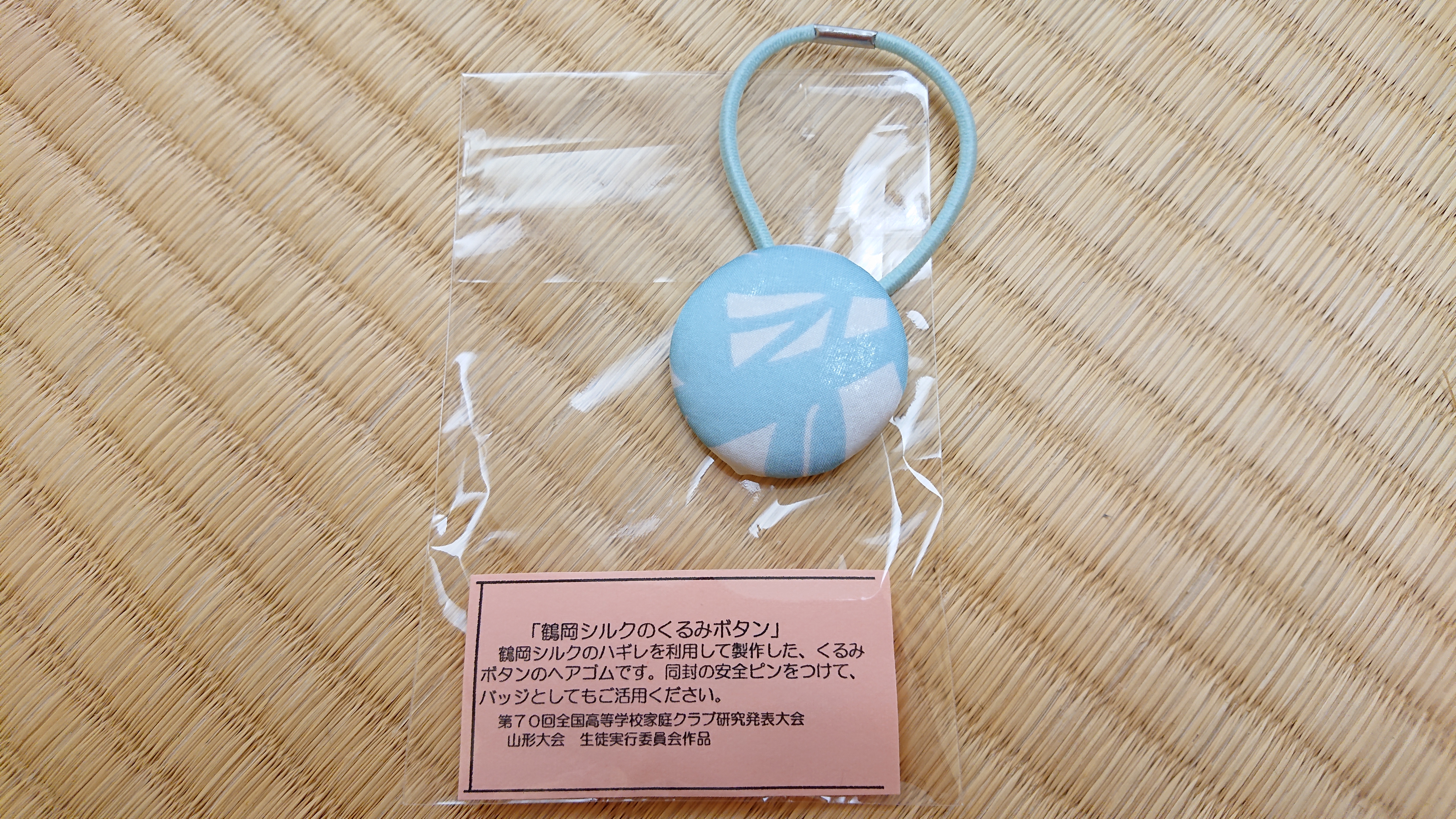 第5専門部の役割の1つに「賞品・記念品の選定」があります。山形大会では参加者全員への記念品として「鶴岡シルクのくるみボタン」がありました。山形県鶴岡市を中心とする庄内地域は国内最北限の絹産地として発達し、今も養蚕から絹織物まで一貫工程が残る国内唯一の地だそうです。この記念品は、生徒実行委員会が鶴岡シルクのはぎれを利用して一つ一つ手作りで仕上げたそうです。大切に使います!!
